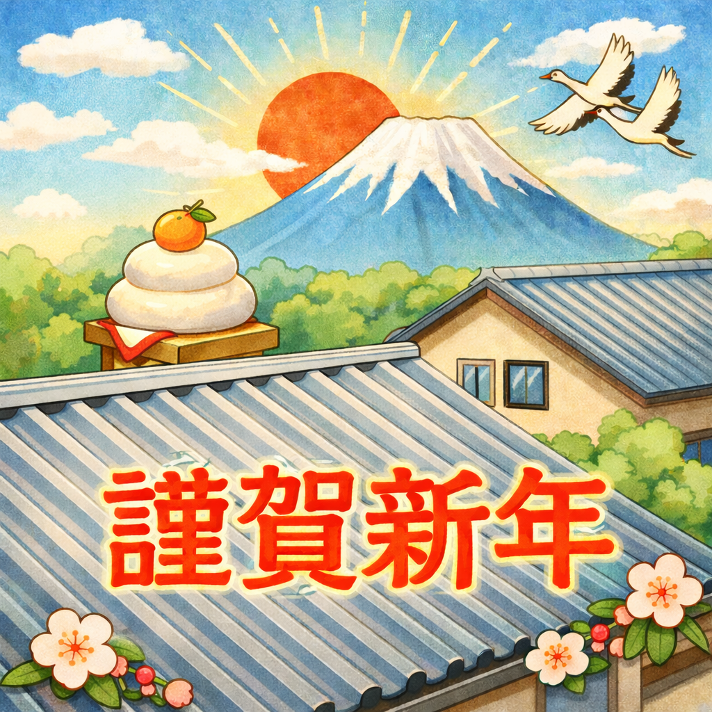 2026年 謹賀新年 新年あけましておめでとうございます。 2026年も屋根・外壁工事を通じて、建物を守る確かな施工と誠実な対応を心がけてまいり ます。地域の皆さまに信頼される仕事を積み重ねてまいりますので、本年もよろしくお願い いたします。本日より通常営業しております。